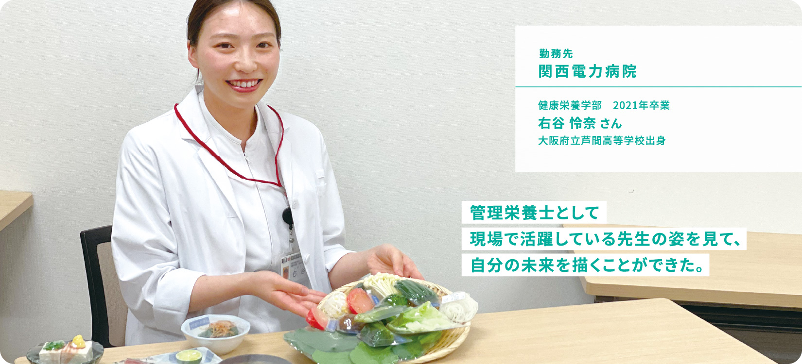I work in the nutrition management office at the hospital. In the rehabilitation ward, doctors, nurses, therapists, and dietitians share information about patients and adjust their diet and provide nutritional guidance. In the outpatient department, I mainly provide nutritional guidance to diabetic patients. The medical field is evolving every day, and there are many things to learn and discover every day, so it's very fun. It makes me happy to talk to patients and see them happy when they can eat better or their test results improve. When I first enrolled at Otemae University, I wasn't sure where I wanted to work as a dietitian, but when I saw the dietitian teachers working hard during my clinical training at hospitals, I decided that I wanted to be like them and decided on the field I wanted to go into. It was also good that the teachers were kind enough to give me advice on my career path.