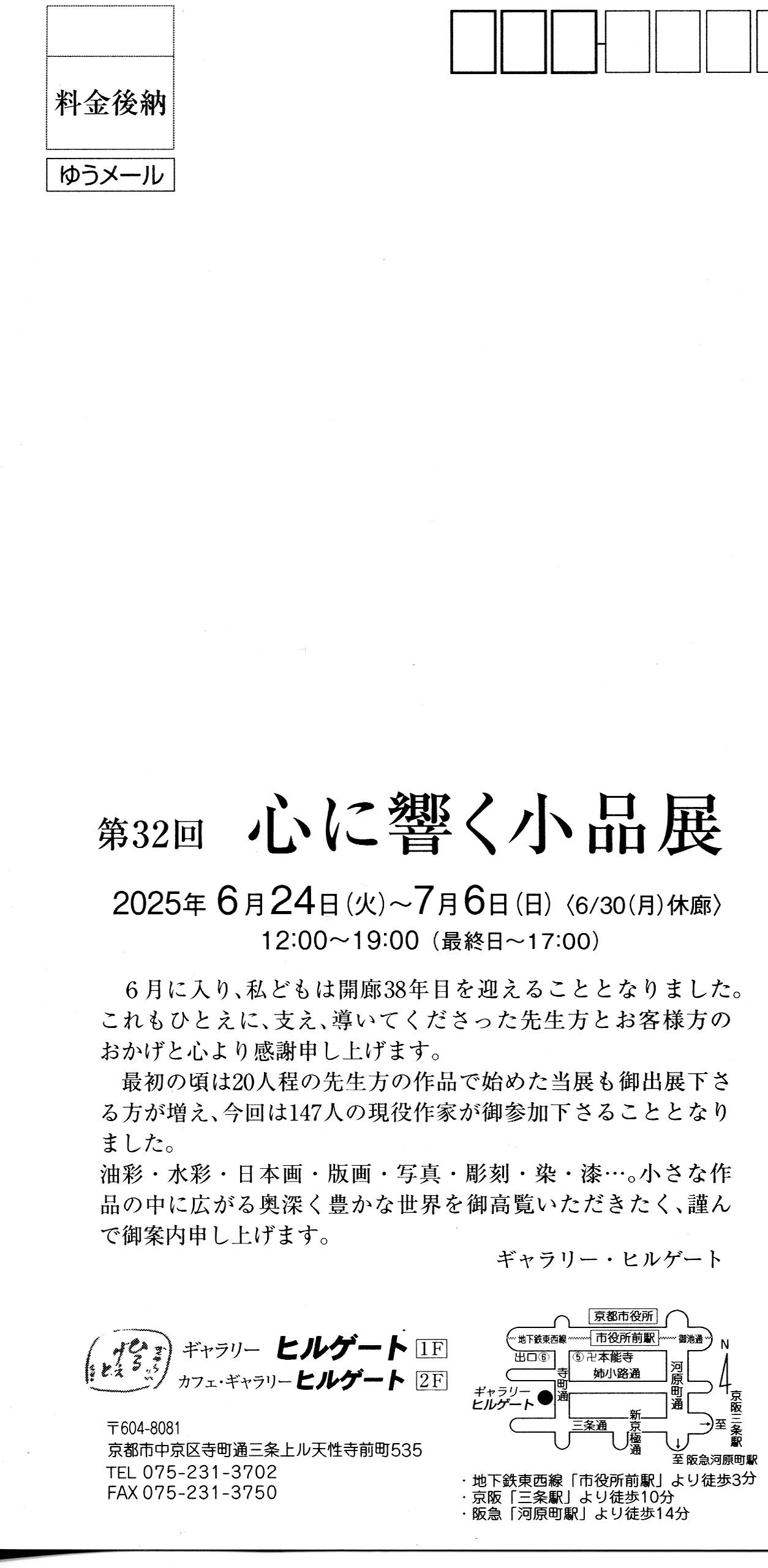 A group exhibition in which Professor Professor Emeritus Masao Hirota is participating is being held at Gallery Hillgate in Kyoto. This time, 147 active artists are exhibiting. Enjoy the deep and rich world unfolding in these small works, including oil paintings, watercolors, Japanese paintings, prints, photography, sculptures, dyeing, and lacquer. If you are in the area, please stop by.