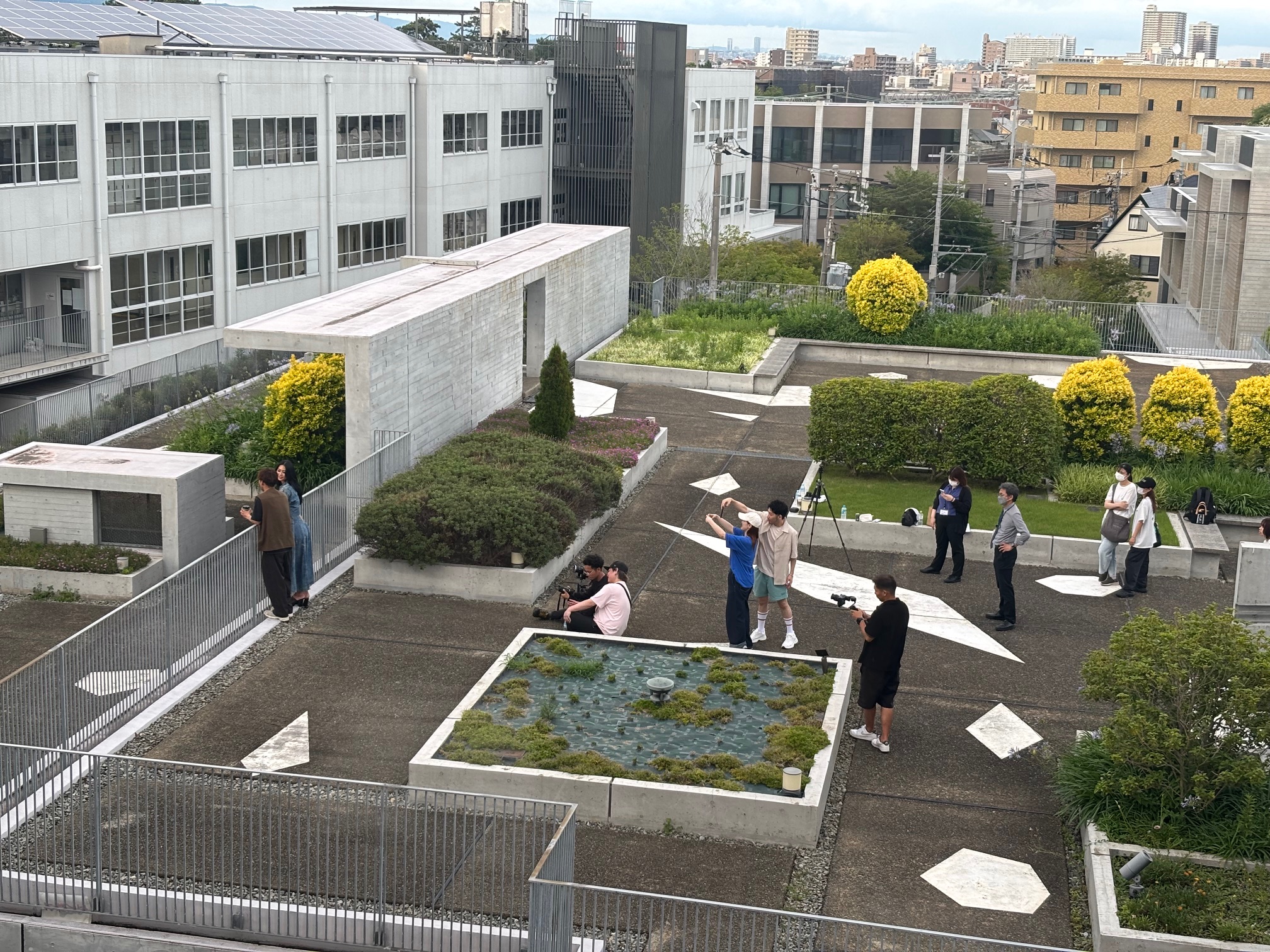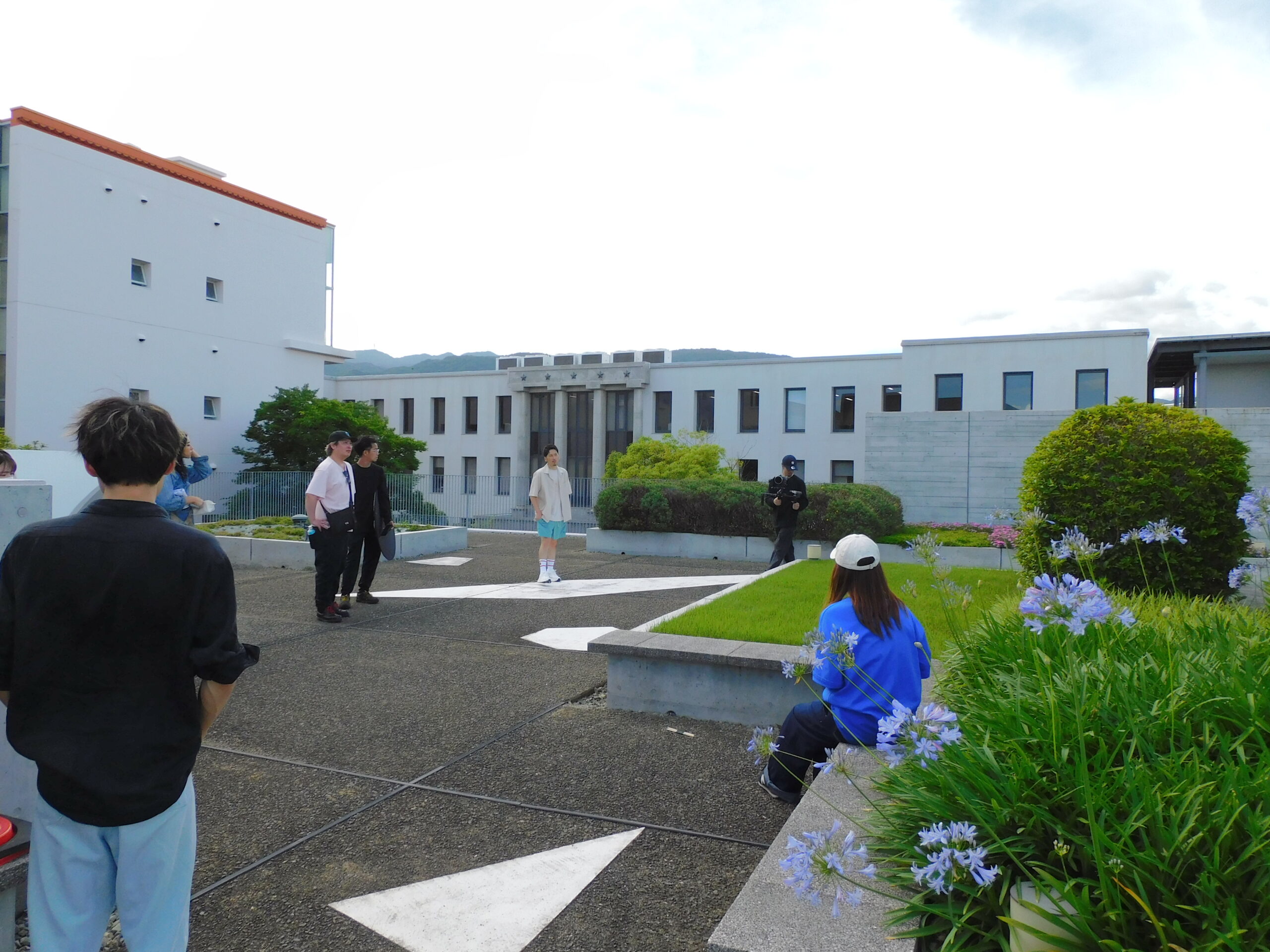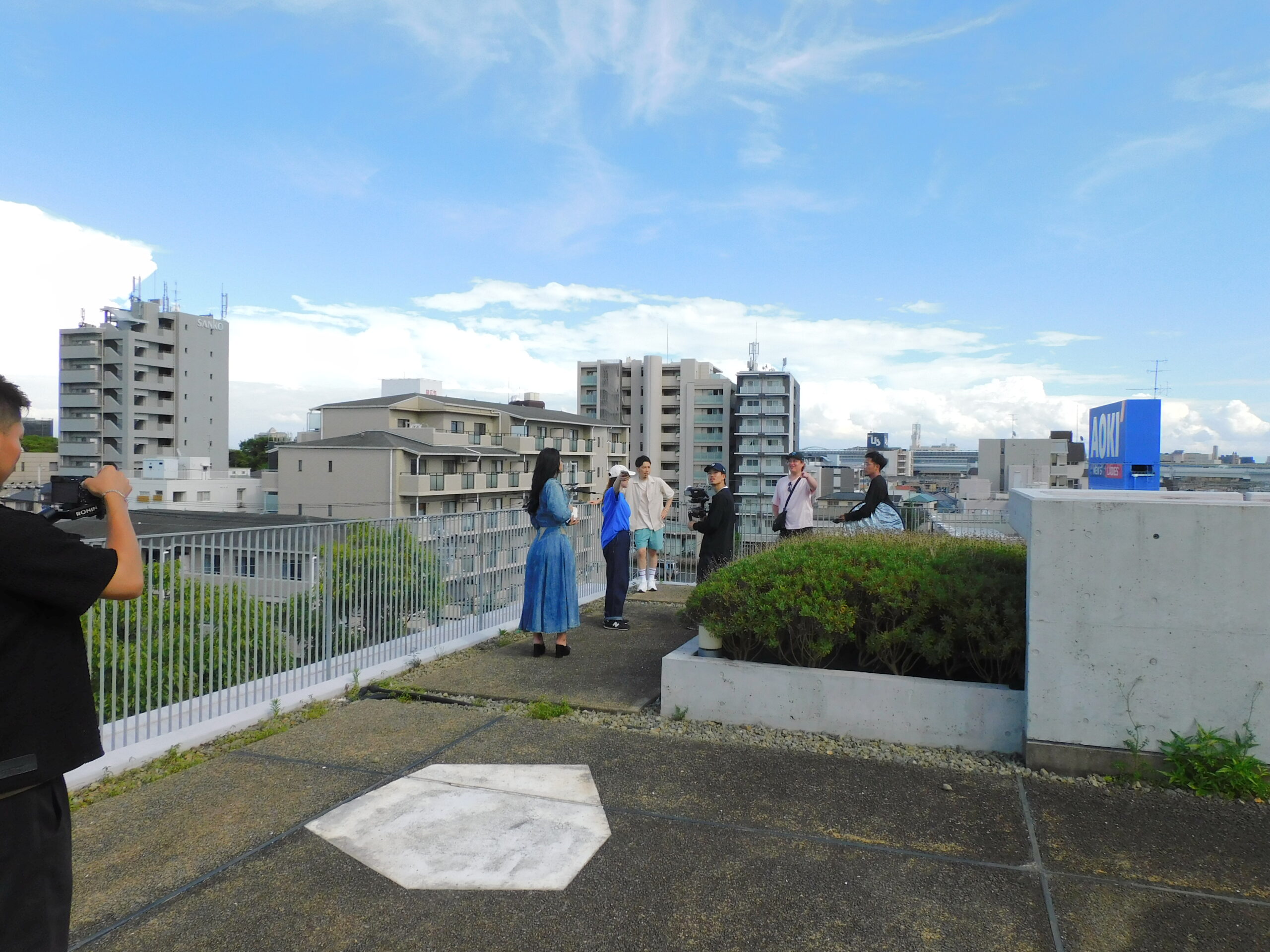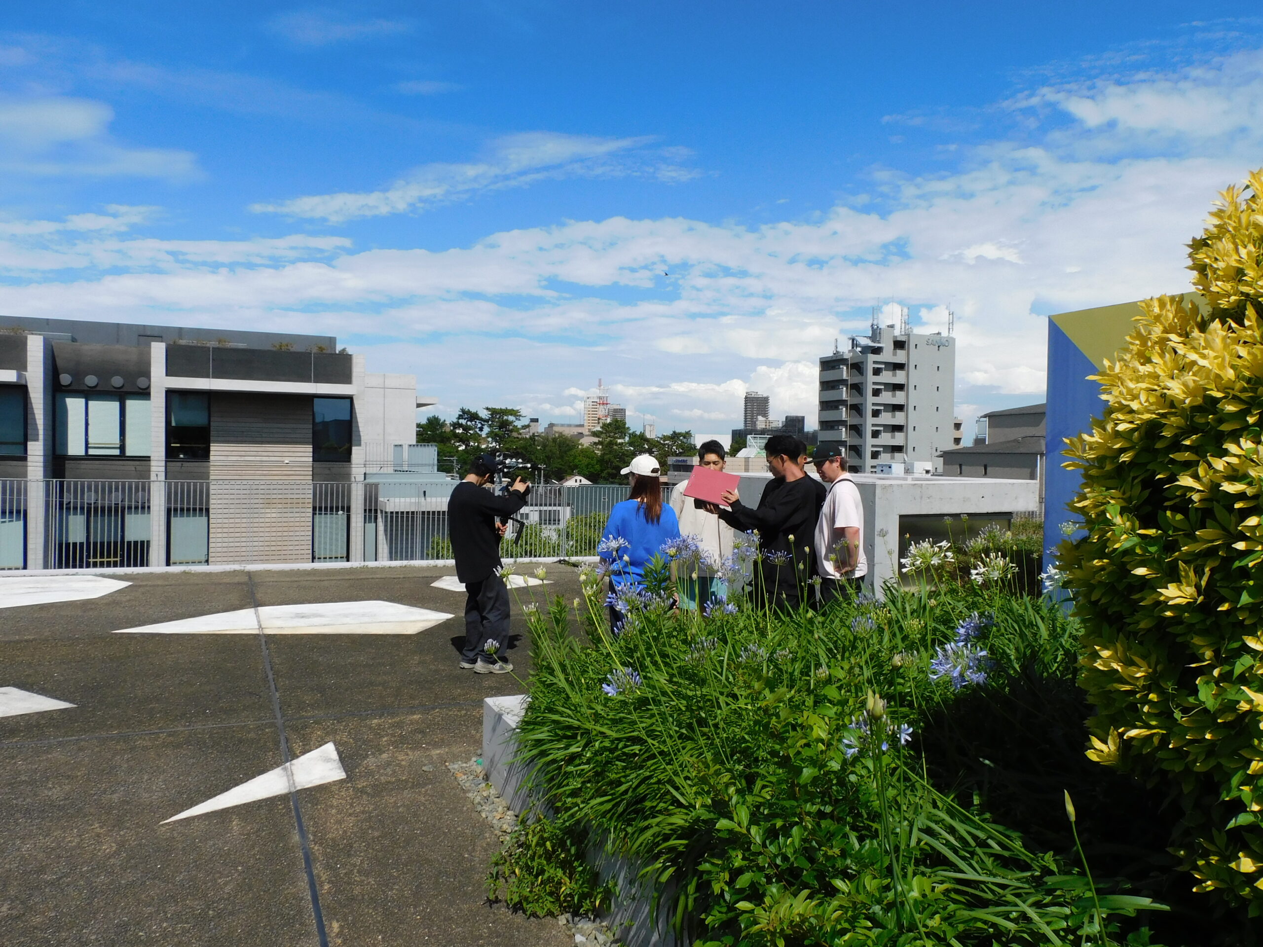 On June 25th, the music video for musician Ryuki Hajimu's new song "Honey" (released on Saturday, July 12th at 8pm) was shot at Sakura Shukugawa Campus. A graduate of our university was involved in the production of the music video, and he suggested filming on campus, hoping that it would serve as a reference for the student video crew. On the day, filming took place on the rooftop of CELL for about three hours amid the intense heat of a sunny day during the rainy season, but it seems that the student video crew enjoyed the time and forgot about the heat.