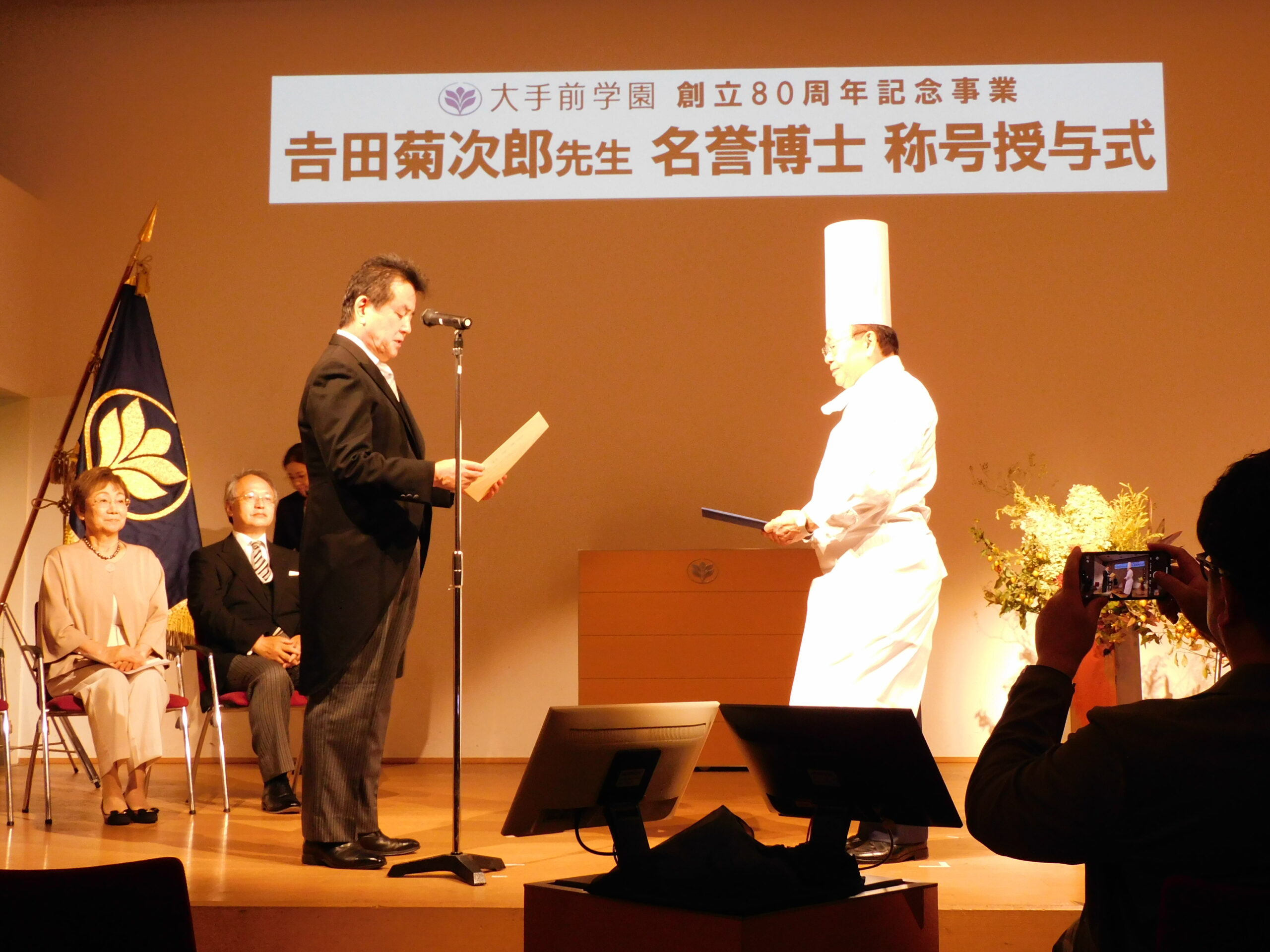 On October 11, a ceremony was held at the Sakura Shukugawa Campus to award an honorary doctorate to Kikujiro Yoshida, Chairman of Boullemish Co., Ltd. for his contribution to the development of the major "Sweetsology" at the Faculty of Arts and Sciences (now Faculty of Intercultural Japanese Studies), where he taught courses on "World Food Culture" as a Otemae University guest Professor from 2012 to 2024. The ceremony was held on October 11 at the Sakura-Sukugawa Campus.