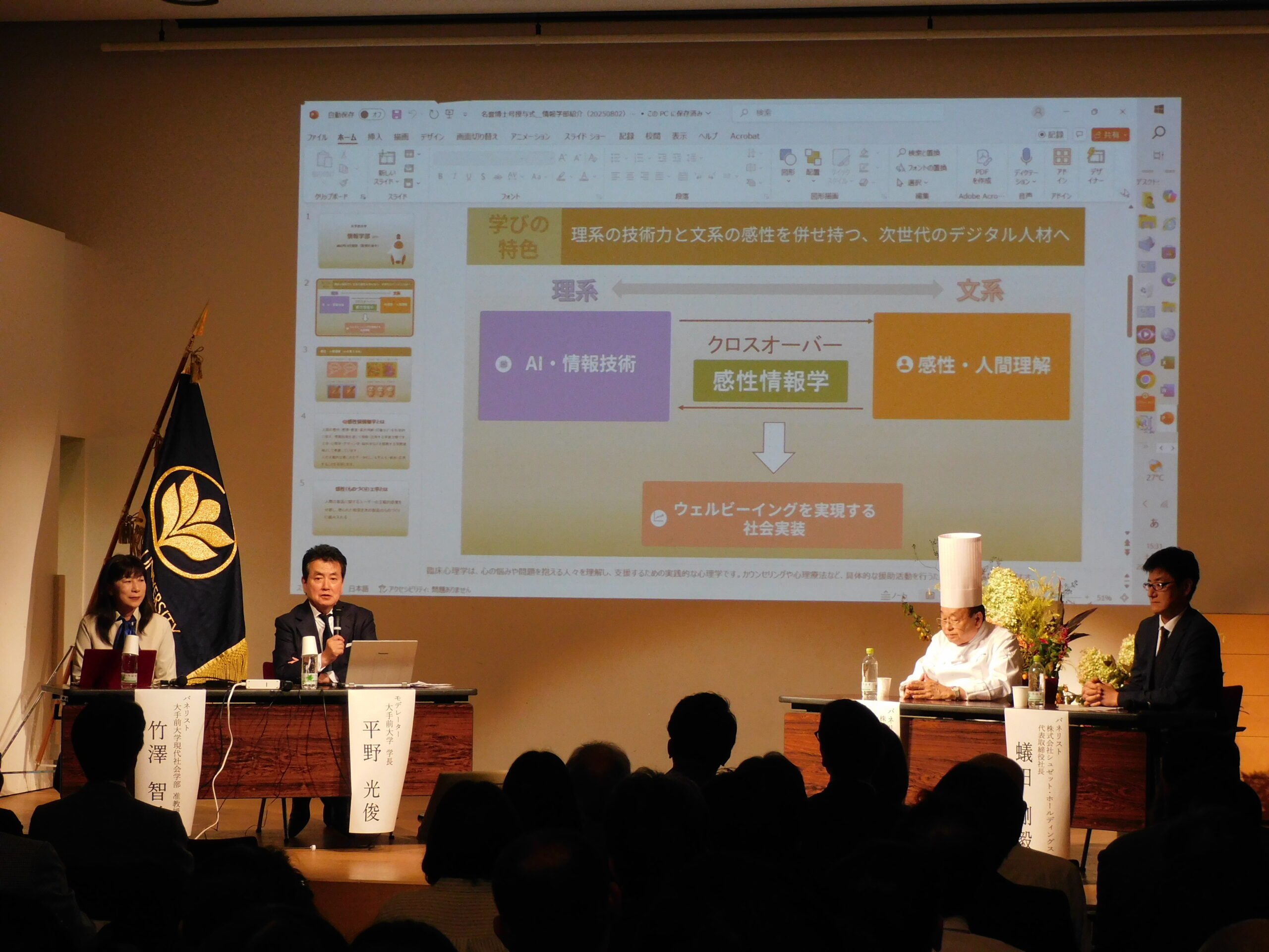 The first part featured an award ceremony and a commemorative lecture by Dr. Emeritus Yoshida on "People Dream of Sweets," and the second part featured panelists Dr. Kikujiro Yoshida and President of Suzette Holdings Co., Ltd., Mr. Takeki Arida, and Otemae University Mitsutoshi Hirano, President.