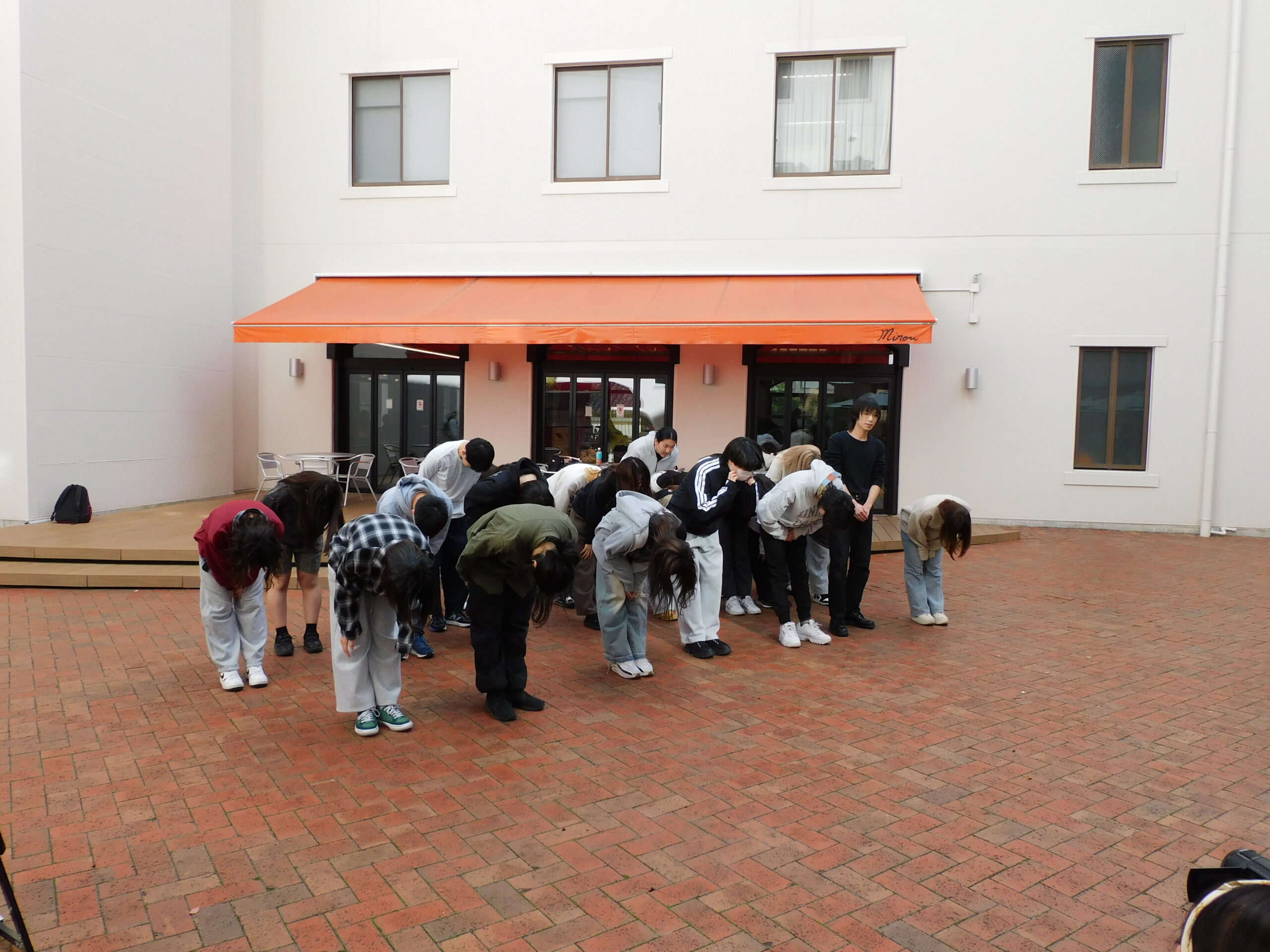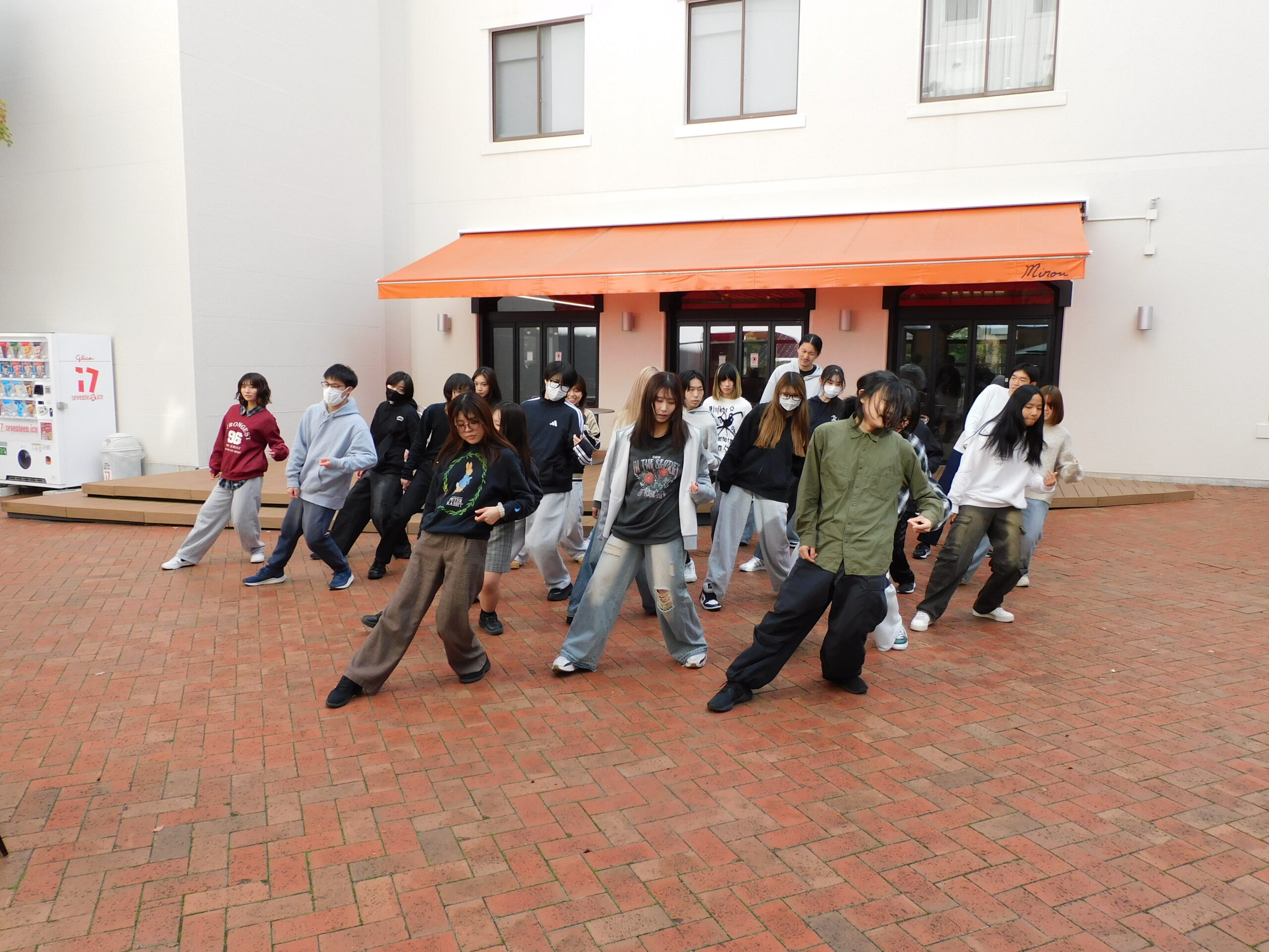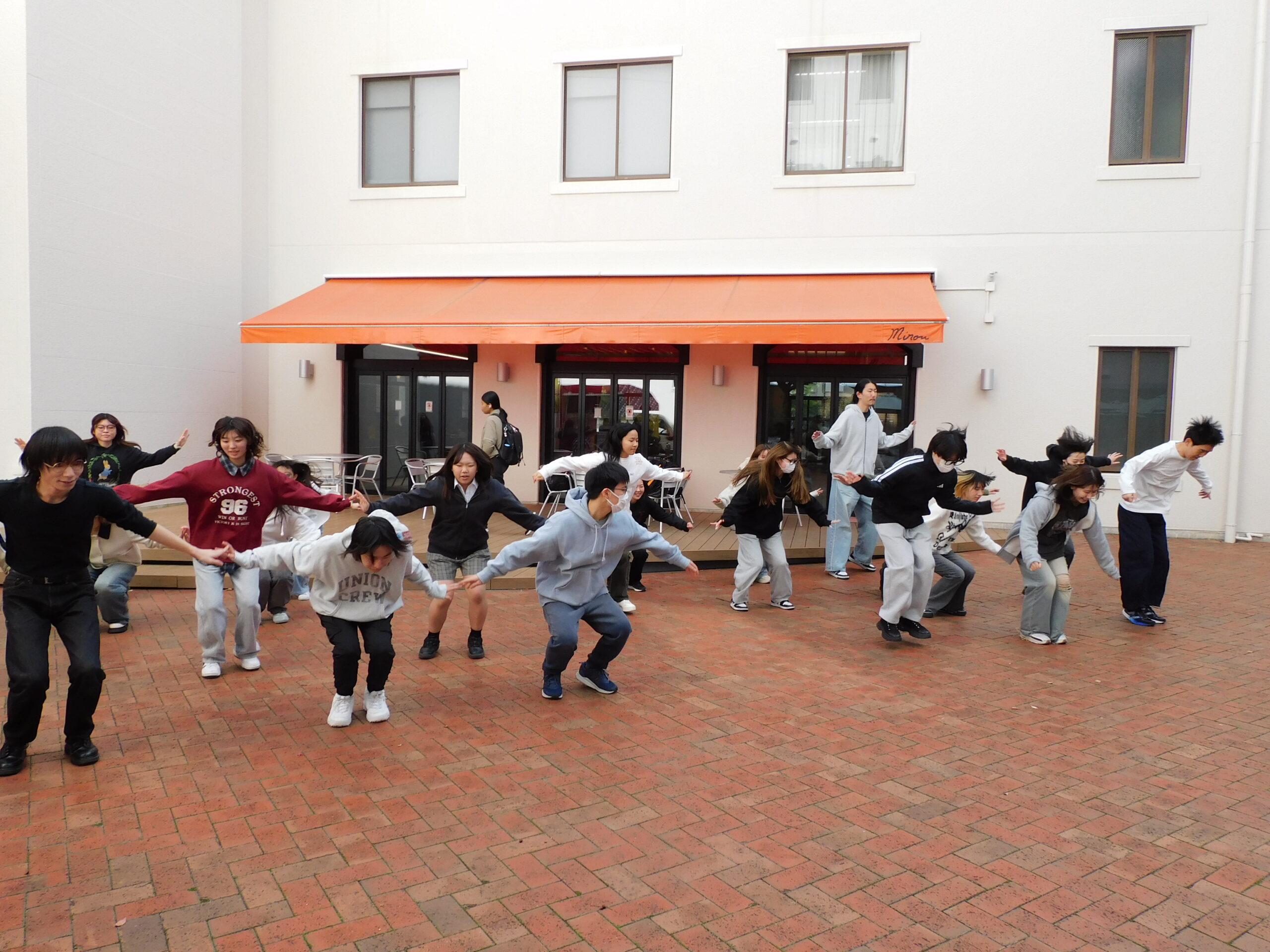 11/19、昼休みのさくら夙川キャンパス中庭で、建築&芸術学部 瀬口教授の授業「パフォーマンス・ワークショップ」の課題である、集団舞踊創作の成果発表がありました。受講生は5週にわたり授業の時間に振付・稽古を重ね、フラッシュモブ(公共の場で突然集まり、ダンスや楽器演奏などのパフォーマンススを行ってすぐに解散するゲリラパフィーマンス)という手法を用い、UNION SQUARE GARDEN “シュガーソングとビターステップ”、米津玄師 “IRIS OUT”の曲に合わせて迫力あるダンスを披露しました。時間はわずか5分足らずでしたが、中庭を通る多くの学生・教職員が足を止め、突然の「ゲリラパフォーマンス」に見入っていました。