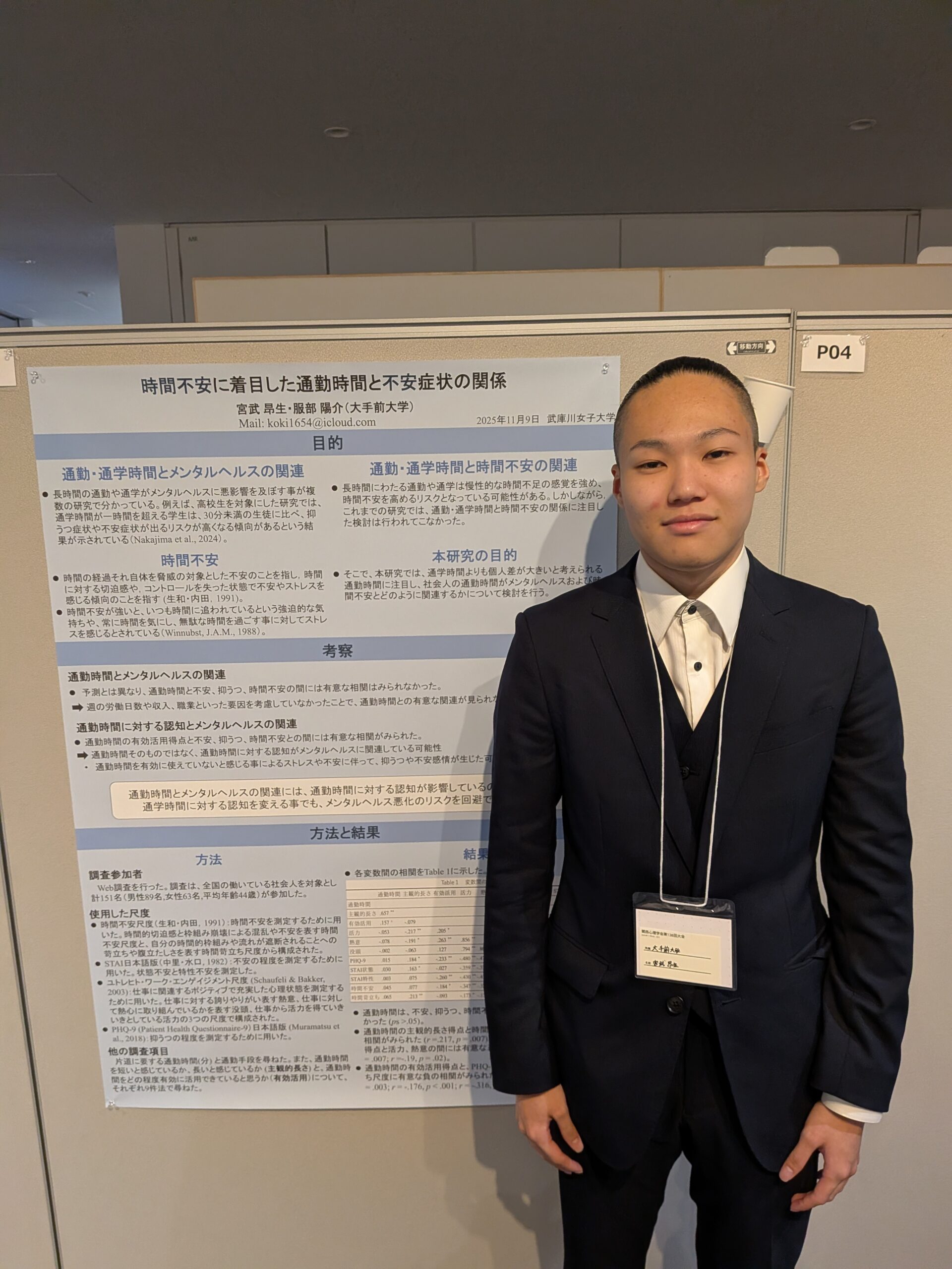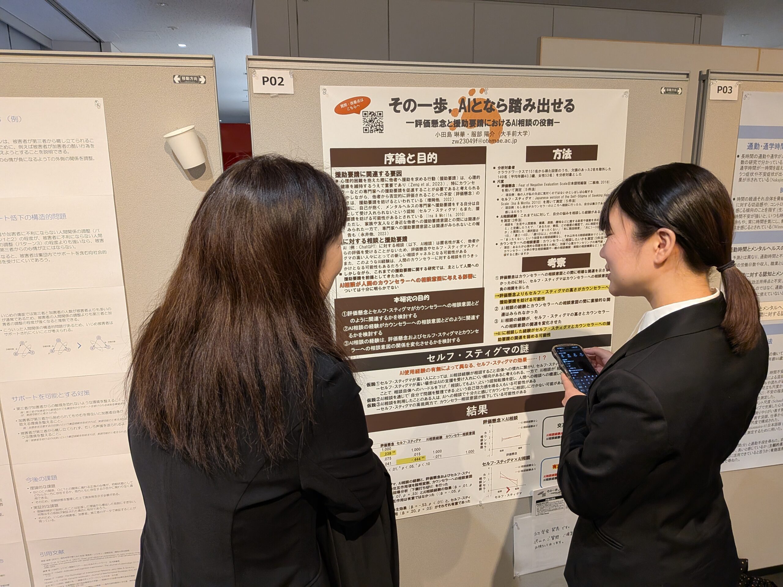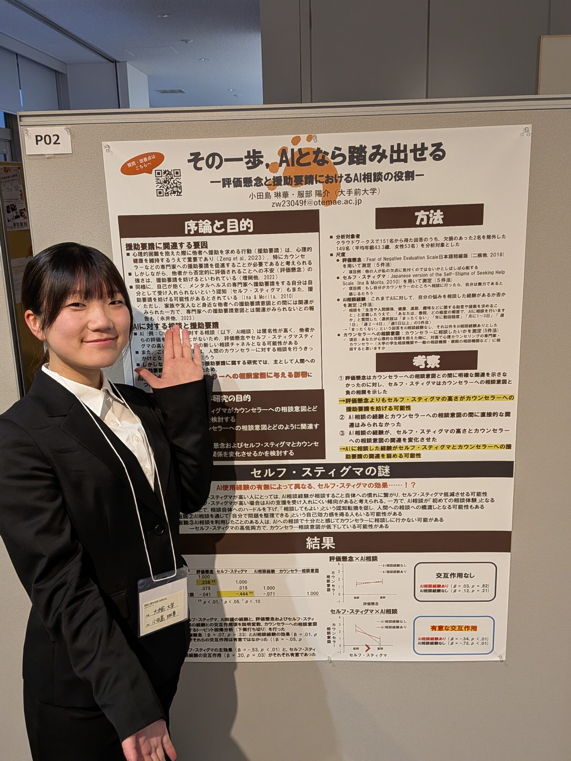 Odashima's presentation theme was "Taking that first step with AI: The role of AI consultation in evaluation concerns and help-seeking," while Miyatake's was "The relationship between commute time and anxiety symptoms, with a focus on time anxiety." After oral presentations in each classroom, they held an exhibition presentation in the entrance hall for approximately two hours. After their first academic presentation, the two had the following to say: