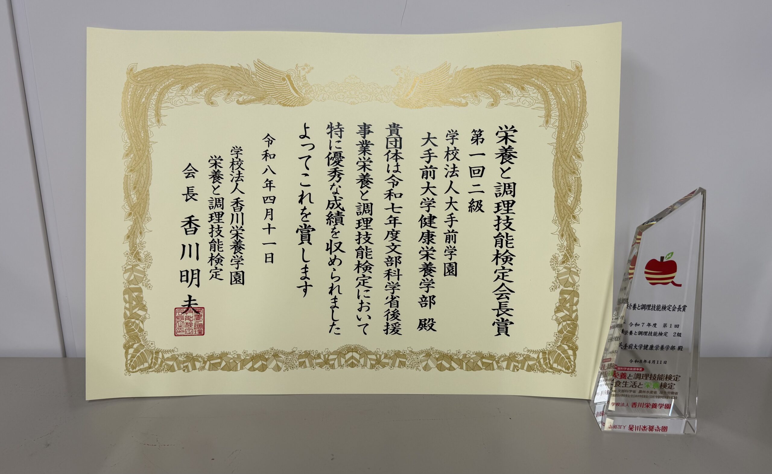 2025年度 栄養と調理技能検定の成績優秀者に対して表彰状が贈られたのを受け、指導教員である禾本講師が東京の香川栄養学園キャンパス内での表彰式に参列しました。大手前大学は今年度も、数多くの賞をいただくことができました。